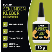 • ARKA KRAFTPROTZ PLASTIK: Der Kleber ist ein echtes Allround-Talent für alle Klebeprozesse, welche schnelle und kraftvolle Verbindungen erfordern. Seine breite Materialkompatibilität mit den unterschiedlichsten Arten von Plastik und Kunstoffen, seine Leistungsstärke sowie eine einfache Anwendung machen ihn zur idealen Wahl.