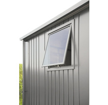 Das Seitenwandelement mit Metallrahmen-Ausstellfenster (Kunststoffglas) bringt noch mehr Tageslicht ins Gerätehaus und gewährt freie Sicht auf den Garten.